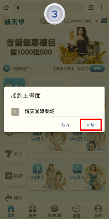 點擊新增,即可增加博天堂官網至手機主頁面